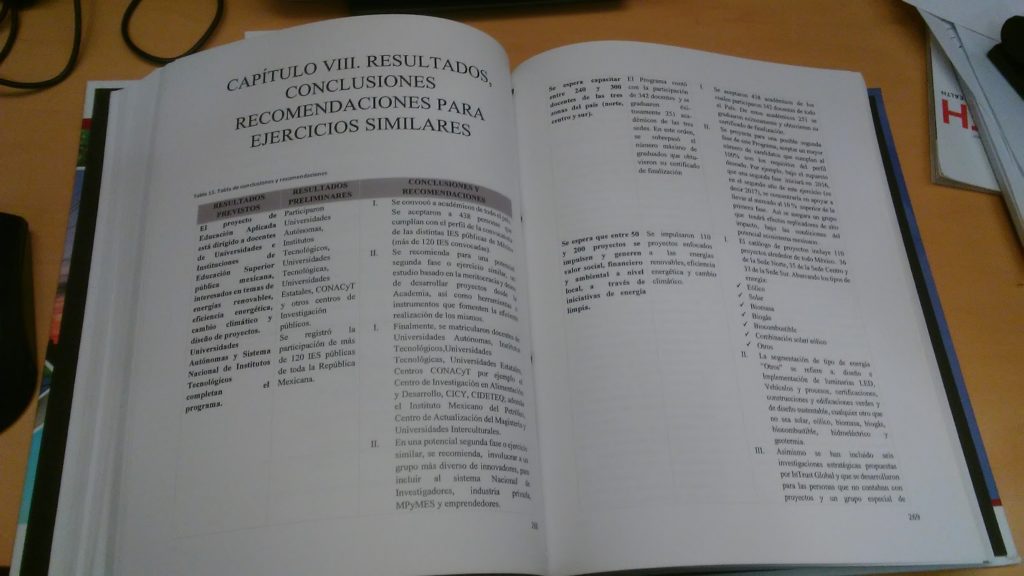 The Applied Program in Renewable Energies and Energy Efficiency was conceived to have approximately 100 graduates among university professors from rural and indigenous universities. Approximately 300 professors were originally enrolled because we thought that there would be a very high attrition rate, but that wasn’t the case and 286 professors finished the program, that is an achievement by itself. Our original aim was to have between 25 and 50 renewable energy and energy efficiency projects and we ended with 93 projects that are still being developed. Originally, we considered that the program should conceive projects for developing at least 100 MW of wind energy, 100 MW of photovoltaic energy and 5 million liters/year of biodiesel. However, the final business and technical plans for renewable energy infrastructure are 953.3 MW of wind energy, 512 MW of installed capacity of photovoltaic energy, 1.36 MW of biomass electricity, 40 million liters of ethanol/year, 7.2 Million liters of biodiesel/year and 9 Million liters of bio-jet fuel/year. So far, infrastructure for projects for 120 MW of wind, 100 MW of solar and 4 million liters/year of biodiesel and 2 million liters/year of bio-jet fuel started to be built in 2016, the rest of the projects are still in the process of finding funders to start construction activities.