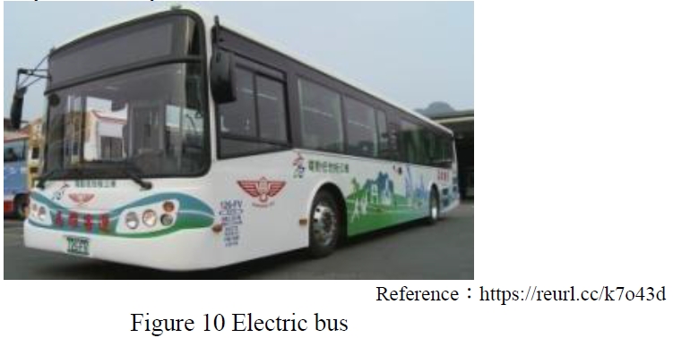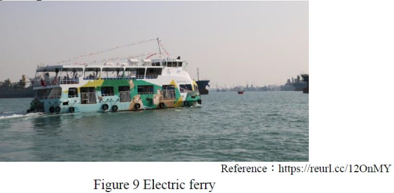 Figure 9: Electric ferry . Reference: https://reurl.cc/12OnMY - Electric buses: Electric buses use power battery-operated instead of fuel. They are exactly the right green-energy, low-carbon, and environmentally-friendly vehicles. In order to promote green transport, reduce pollution emissions from mobile pollution sources, and reduce pollution emissions from buses, the Kaohsiung City Government has promoted “Green Kao-Ping Electric Bus Project”, thereby creating low-carbon public transportation. (Corresponding to Figure 10 below)