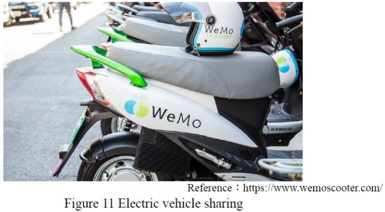 Figure 10 : Electric bus . Reference: https://reurl.cc/k7o43d - Electric motorbikes sharing: Electric motorbike is a means of transportation featuring both low-carbon emission and convenience. It not only reduces carbon emissions but also reduces dependence on petroleum and demand. Through “renting instead of buying”, the private vehicle holding rate can be reduced to lower environmental pollution and traffic congestion problems in the city. Currently, the GoShare services provided by MeN Go include: WeMo Scooter, UrDa, etc.