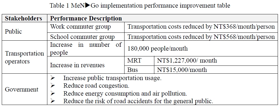 The MeN Go service promotion performance includes: Increase public transportation usage, increase the incomes of operators, reduce public spending on transportation, reduce energy consumption and air pollution, reduced the risk of traffic accidents, etc. The related quantification of the project analysis is as follows: (Corresponding to Table 1 below)