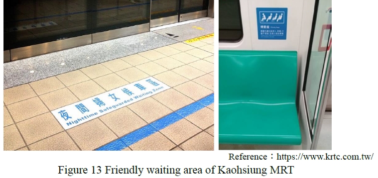 - Gender equality facilities: Women’s evening waiting area is available at the MRT stations; nursing rooms have also been set up in public transportation stations.
