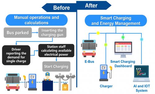 Currently, most electric buses primarily charge during nighttime. By implementing the system developed in this project, allowing charging of electric buses during the daytime can significantly reduce the costs associated with charging them all at the same time. As a result, the contracted capacity is expected to be reduced by around 50%, leading to substantial reductions in operational costs for bus companies.