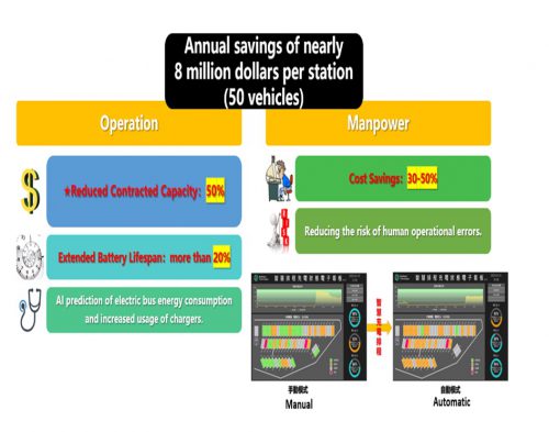 Gradually expanding to all electric bus stations in Chinese Taipei to meet the charging needs of approximately 12,000 city buses, with a total contracted electricity demand of about 250,000 kilowatts; This smart transport solution is extended to support all bus stations in Chinese Taipei, the anticipated quantifiable benefits are estimated to reduce the monthly contracted electricity costs by approximately 0.1 to 0.2 billion US dollars, increase the battery durability, reducing battery usage costs by around 1.5 to 2 billion US dollars every year, and considering the personnel savings at bus stations of about 0.3 billion US dollars, resulting in an overall savings up to 3 to 4 billion US dollars every year.