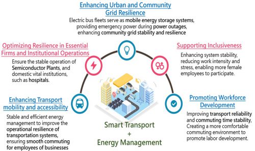The smart transport solution and policy developed in this project not only supports charging services for different types of vehicles in smart cities (such as electric buses, electric logistics vehicles, and electric passenger cars) but also, through the application of V2G (Vehicle-to-Grid) technology, can treat electric commercial vehicle fleets such as electric buses as part of a “mobile energy storage system.” This system can provide emergency power supply for specific areas or critical infrastructure (such as hospitals) during temporary power outages caused by disasters. It can also cooperate with the virtual power plant mechanism of power companies to dynamically provide the stored energy on buses in parking lots, assisting the regional grid in providing stable power services and strengthening the resilience of urban and community power grid.