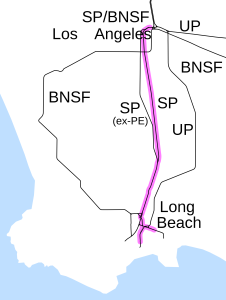 The Alameda Corridor originated as an attempt to combine four different freight rail lines that were operated through the city of Los Angeles from the Port of Long Beach and the Port of Los Angeles. This is illustrated below, with the existing freight lines shown in relation to the Alameda Corridor (highlighed in pink). In 1994, the Alameda Corridor was purchased by the two ports from Southern Pacific for $235 million US.