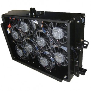 The new retrofit addition, a miniHYBRID thermal kit from Engineered Machined Products, is a fully contained system. It replaces the original bus alternator and cooling system with a high output alternator and a cooling package of heat exchangers and eight electronically controlled electric fans. This upgrade includes temperature sensors for the engine charge air and engine jacket water flow paths in order to optimize cooling of those systems separately