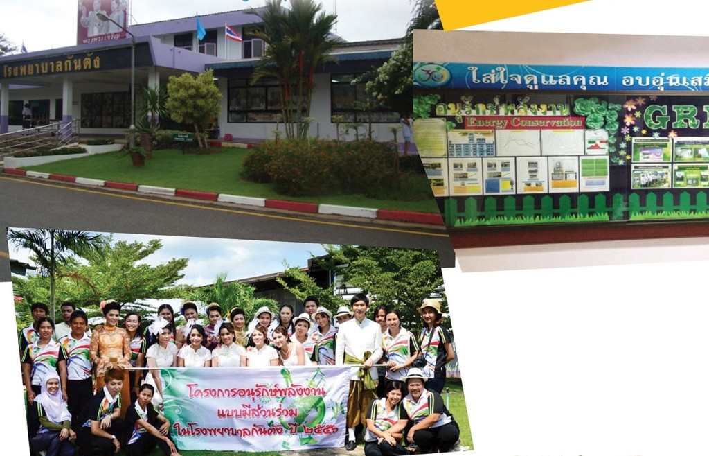 Kantang hospital is community hospital (non-controlled building) which can serves 60 beds. Number of building users was about 154,953 people/year (staff 251 person, IPD 52 person/day and OPD 522/day). There are 2 categories in working time; the first category is 24 hours nursing, 3 shifts with 8 hours each (ER, delivery operation, IPD) and the second category is working hour 8.30 A.M.-4.30 P.M.. The hospital has the area between each buildings with the complex medical service including managing building, OPD/IPD building, emergency room, operation room, pipeline system, autopsy room, and library room. The hospital consumes 3 main types of energy which are electricity, diesel and LPG. The average total energy is 6,043,573.90 MJ/year. Energy conservation has been operating since 2010 by leading of Dr. Yodsagorn Nedsaengtip, MD. as a director of this hospital. As the result, the trend of energy dramatically decrease due to participating of all officers to drive the plan to save the energy. In addition, 3P (Place, People and Process) strategy are important to operate energy conservation. In conclusion, all of these could help save 15,008.02 kWh per year calculated as 64,834.65 baht per year. Moreover, energy efficiency index (EEI) of the hospital was 101.27 MJ per bed-day in 2013. It decreased 5.61 percentage of EEI in 2012
