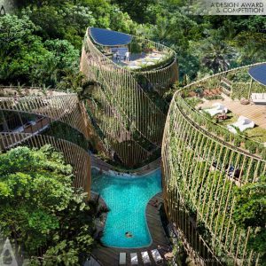 The project consists of 3 buildings of 5 stories each. It is composed of a concrete structure and an independent bamboo facade. Every floor is an open space where multiple configurations could be designed. The apartments are 120 and 60 square meters, having 1, 2, or 3 bedrooms. The project resides on a 2046 square meter lot and, occupying just 30% of it, preserves plenty of the existing vegetation. It restores 2,500 square meters of the removed vegetation by implementing green roofs and facades.