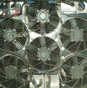 TriMet retrofitted each of the 39 hydraulically-driven bus cooling systems with a miniHYBRID thermal kit, a fully contained cooling system manufactured by Engineered Machined Products (EMP). A high output alternator and a system of heat exchangers and eight electronically controlled electric fans replace the original bus alternator and cooling system. The miniHYBRID kit includes temperature sensors for the engine charge air and engine jacket water flow paths to separately optimize cooling of those systems. Previously, TriMet helped EMP bring this miniHYBRID electronic cooling system to market by funding its development, testing, and evaluation in transit applications, and in May 2009, TriMet and EMP were honored with the EPA Clean Air Excellence Award.