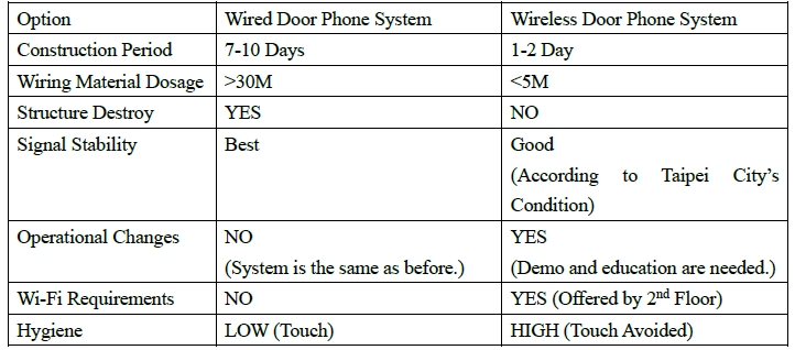 Option | Wired Door Phone System | Wireless Door Phone System |