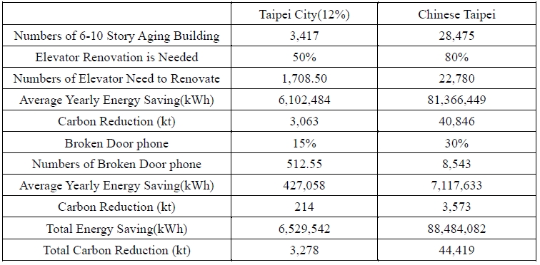 The potential of energy saving was illustrated in Table 5, so the repetitious detail will not discuss in this section. This section focuses on the policy expansion effect within Chinese Taipei. Bureau of Energy launched the “New Energy Saving Campaign”, allocating funds to six capital cities and thirteen counties. Therefore, other than Taipei City, other local governments have similar initiatives related to energy saving. The successful story by elevator renovation and behavior-changing can be applied to all. Also, the approach of behavior-changing can be expanded to other systems, such as lighting, water usage, and many others.