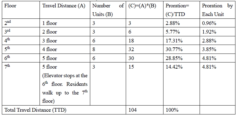 Floor | Travel Distance (A) | Number of Units (B) | C = A × B | Proration = C / TTD | Proration by Each Unit |