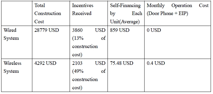 System Type | Total Construction Cost | Incentives Received | Self-Financing by Each Unit (Average) | Monthly Operation Cost (Door Phone + EIP) |
