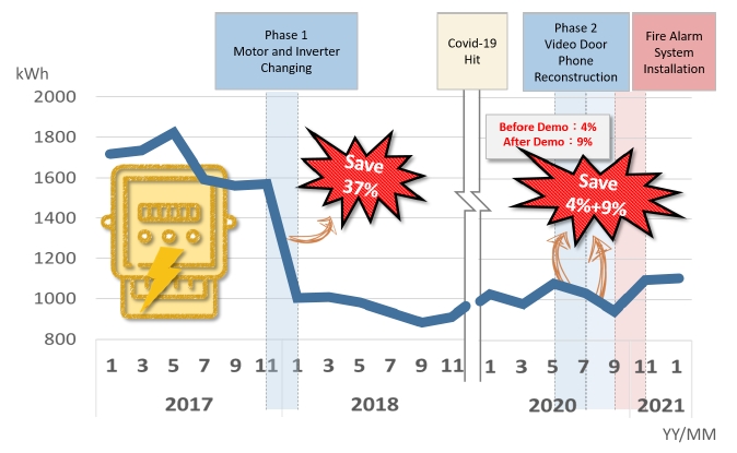 All systems such as the lighting system, air conditioning remained the same in YF, except for elevator energy upgrades. Thus, although there is no specific meter for the elevator, the electric bill can be seen as an indicator. In phase one, it showed a 37% energy demand decrease from 1600 kWh to 1000 kWh/month. In phase two, it is evident that behavior changing through smart management can save around 13% more energy in this type of small apartment complex without a management team to handle maintenance for common areas.