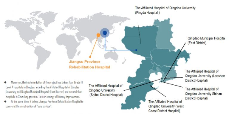 The project takes a practical medical institution as a typical case of energy efficiency improvement, providing reference for medical buildings in Qingdao and even the Asia Pacific region. With both social significance and economic value, the innovative technical route and financial model are important for promoting the energy efficiency improvement of medical buildings, saving building energy consumption, saving social resources and driving the energy-saving development of medical buildings. In addition, the implementation of the project can effectively promote the development of energy-saving technology and energy-saving industry, increase jobs and promote the development of low-carbon economy. Moreover, the implementation of the project has driven four Grade III Level A hospitals in Qingdao, Qingdao Municipal Hospital (East District) and several Grade III Level A hospitals in Shandong province to start energy efficiency improvement. At the same time, it drives Jiangsu Province Rehabilitation Hospital to carry out the construction of “low carbon”.