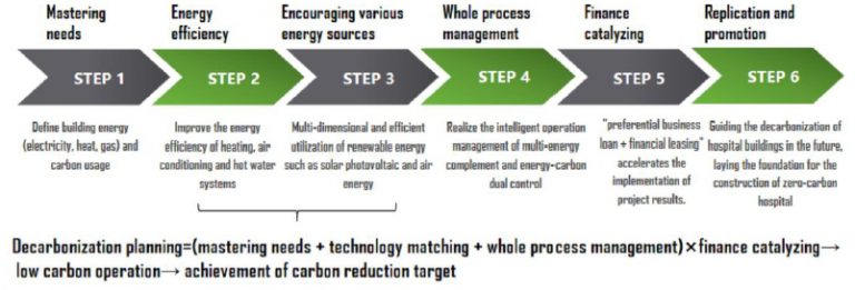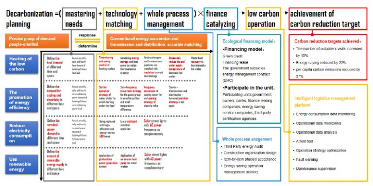 In the process of low-carbon renovation, first on-site research and testing work was carried out to conduct a comprehensive and detailed diagnosis and assessment of the energy consumption of the project, and to match the existing problems with appropriate technologies, so as to formulate detailed energy efficiency improvement implementation plans and schemes. The simulation evaluation of the implementation effect of the plan was conducted. And the whole-process management was used to ensure the implementation and the effect of technical measures. In the process, financial means are used to catalyze the project process, so that the energy-saving results can be quickly implemented. After the completion of the project implementation, the long-term effectiveness of it will be guaranteed through intelligent operation and management, so as to achieve the project carbon reduction goal.