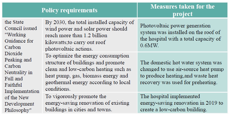 The Central Committee of the Communist Party of China (CPC) and the State Council issued “Working Guidance for Carbon Dioxide Peaking and Carbon Neutrality in Full and Faithful Implementation of the New Development Philosophy”, which clearly proposed to vigorously develop energy-saving and low-carbon buildings and to promote the large-scale development of ultra-low energy consumption, and low-carbon buildings. Through carrying out measures of energy conservation and carbon reduction for hospital buildings, the project just meets the requirements of the Working Guidance. In the process of renovation, we actively explore the sustainable development of hospital buildings, improve the utilization rate of renewable energy, and help city achieve sustainable development from hospital’s aspect, which is in line with the exploration of sustainable development model of city by the energy working group.Meanwhile, through energy-saving renovation, the hospital has created more employment opportunities to promote economic recovery while fighting against the pandemic. And it has built a smart logistics management platform in response to the initiative of APEC Leaders Summit in November 2021 on promoting innovative digital economy to fight against the pandemic and stimulate economic recovery.