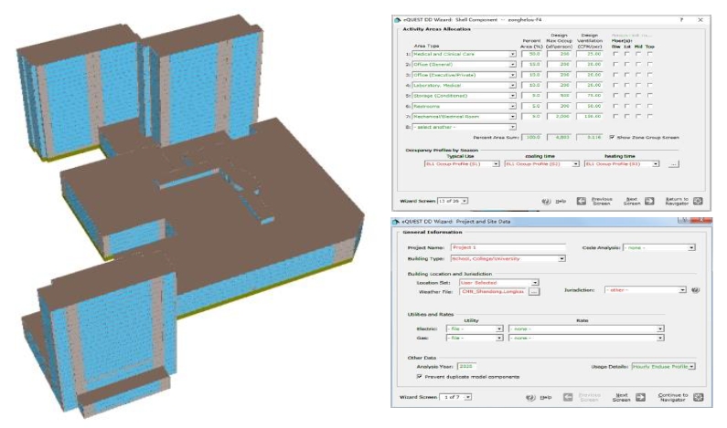 In the process of plan design, it is necessary to fully consider the economic rationality and the needs of users. In order to verify the feasibility of the plan, after its completion, eQUSET is used to build a 3D model of the project based on the basic building information and architectural drawings. Based on the typical meteorological year of Qingdao, the outdoor meteorological parameters of the urban area is simulated. According to the investigation and renovation plan, some parameters will be set, such as the operation time, indoor parameters, maintenance of structure thermal performance, personnel demand and so on. The energy consumption model for the project of the Affiliated Hospital of Qingdao University (West Coast District Hospital) is established to conduct dynamic simulation analysis for 8760 hours throughout the year.