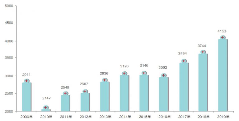 Figure 2 The development of medical and health institutions in Qingdao from 2000 to 2019.